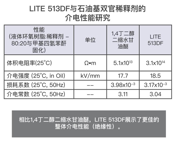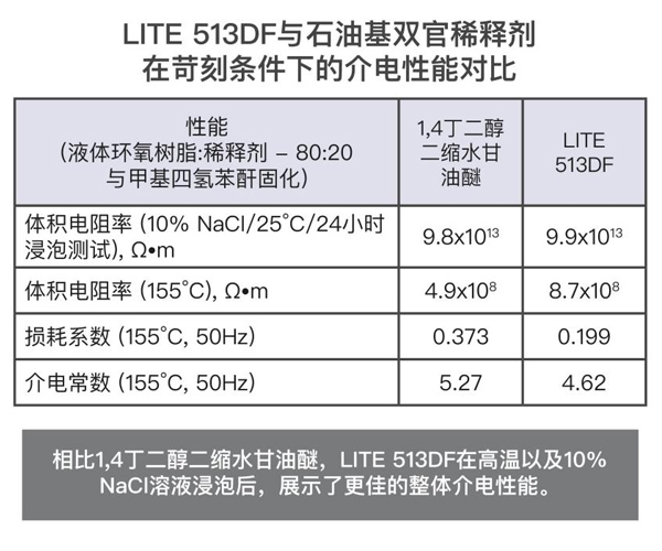 根據(jù)iec 62631和iec 60243標準進行測試,如其介電性能所示,lite 513df提供了良好的絕緣性能。在epon 828的配方中,樹脂的使用量為20%,用mthpa(甲基四氫鄰二甲酸酐)固化,并用bdma(芐基二甲胺)催化。lite 513df展示了優(yōu)異的結(jié)果,其體積電阻率和介電強度更高,損耗因數(shù)和介電常數(shù)比競品1,4丁二醇二縮水甘油醚更低。當兩種稀釋環(huán)氧樹脂體系都暴露于高溫或鹽溶液中時,lite 513df的性能優(yōu)于石油基雙官能稀釋劑。lite 513df是一款良好的環(huán)氧稀釋劑和改性劑,適用于電氣灌封、鑄造和封裝(浸漬樹脂)。